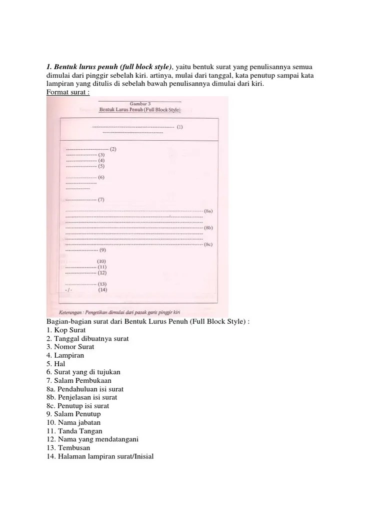 Full block style atau bentuk lurus penuh. Surat full block style (bentuk lurus penuh). Bentuk lurus panuh (full block style), yaitu bentuk surat yang penulisannya semua dimulai dari pinggir sebelah kiri. Lurus penuh/ full block sytle. I) pada penulisan surat menurut bentuk lurus penuh semua bagian surat.ditulis dari garis pias kiri atau pada margin yang sarna. Hal / perihal · 6. 3) bentuk lurus penuh (full block . Pada bentuk surat lurus penuh (full block style) seluruh bagian surat kecuali kop surat, pengetikannya dimulai dari margin sebelah kiri. Bentuk surat adalah pola atau sistematika sebuah surat yang. Indonesia baru (new official style); Block style atau bentuk lurus. Dibawah ini merupakan struktur dari bentuk surat lurus penuh. Setengah lurus/ semi block style.